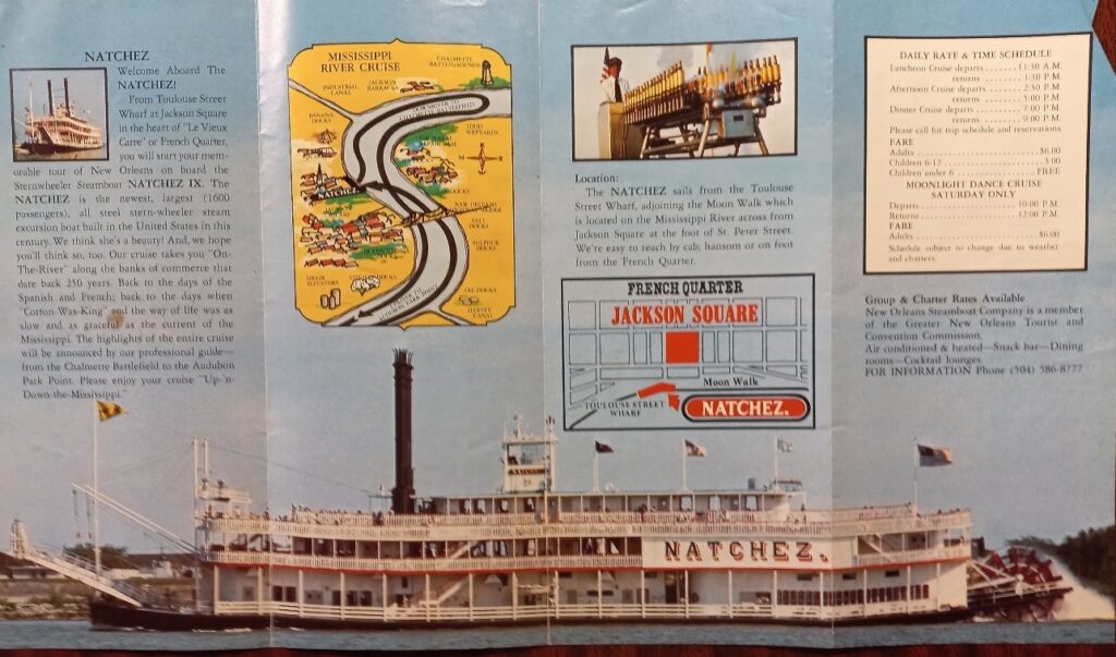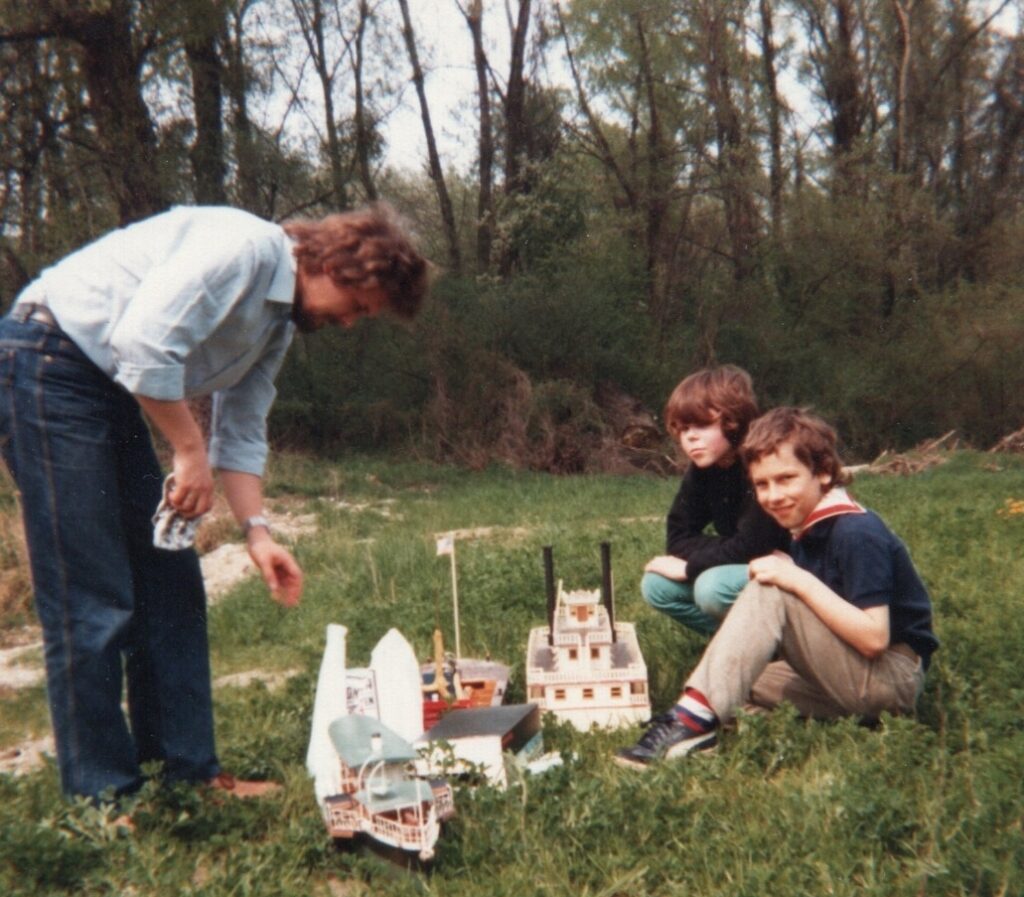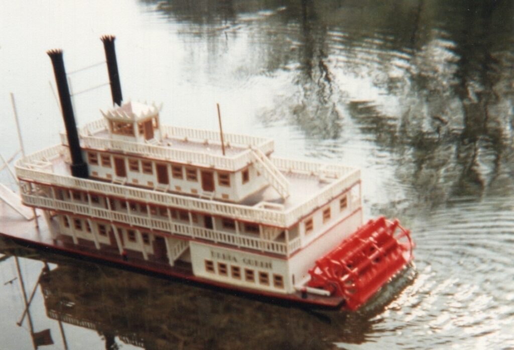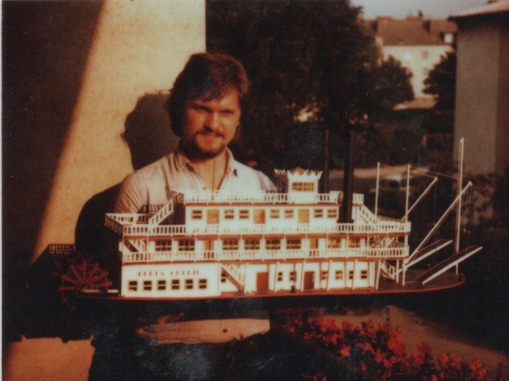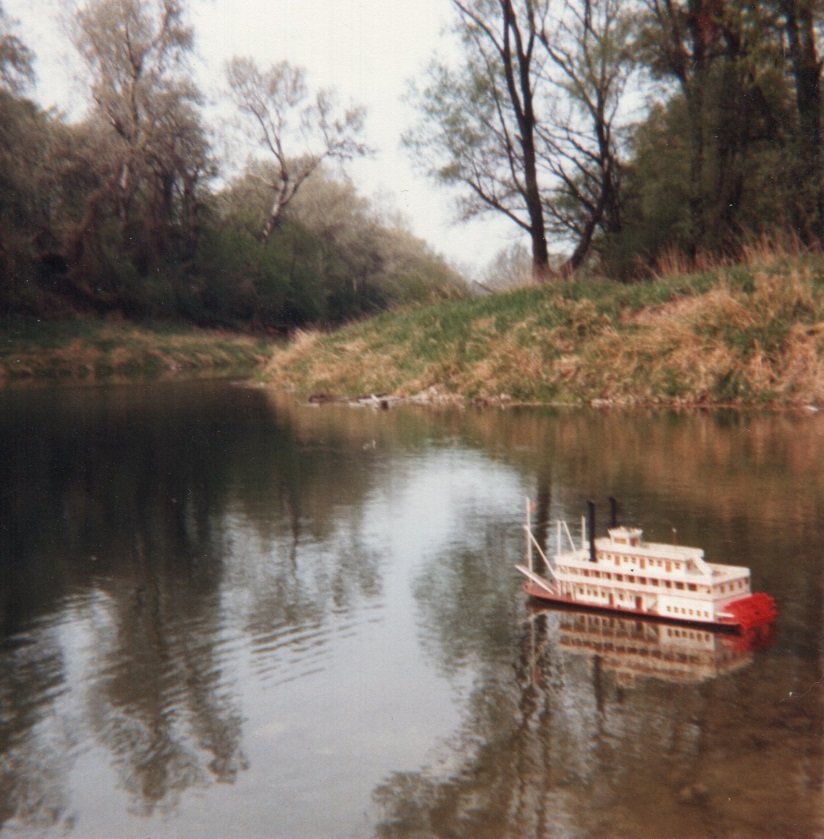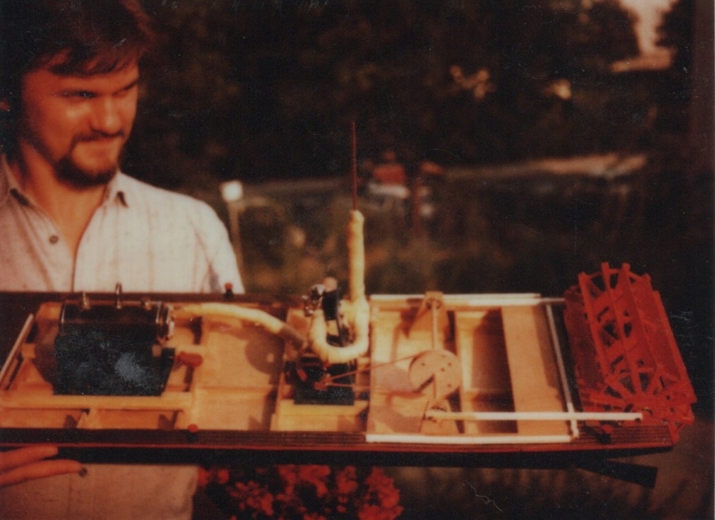 Meine Eltern brachten von eine USA-Reise ein Rundfahrt-Prospekt mit, das mir als Grundlage für den Entwurf eines Mississippi Dampfers mit Heckantrieb diente. Mich interessierte dabei vor allem die sichere Kraftübertragung von der Maschine zum Schaufelrad. Darüber hatte ich nämlich während des ansonsten geisttötenden Packelschupfens in der Paketumleitung der Post im Wiener Westbahnhof (Zivildienst) nachgedacht.