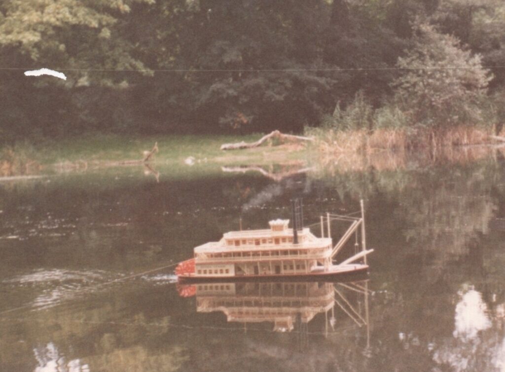 Für eine Fernsteuerung fehlte mir das Geld. Eine lange Angelschnur sollte das Modell zum Ufer hin gegen ein „Abhauen“ sichern. Die beiden Steuerruder hinter dem Schaufelrad konnten nämlich nur fix auf eine Kreisfahrt eingestellt werden, was bei Wind zu unsicher schien.