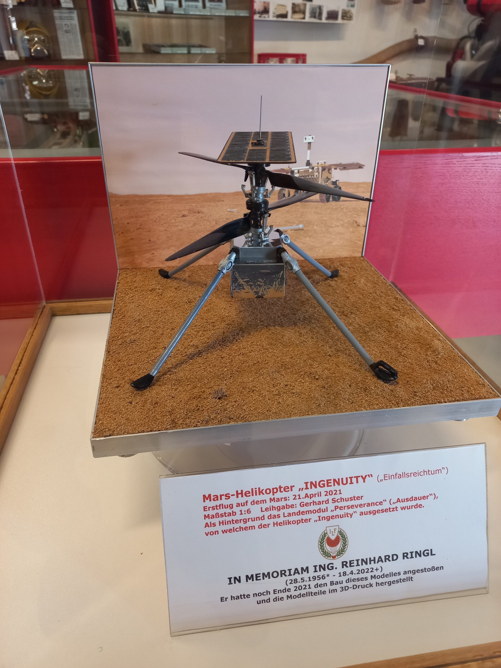 Ich habe das Modell aus Resinteilen im April/Mai 2022 für eine Ausstellung der ILF – Interessengemeinschaft Luftfahrt Fischamend gebaut. Die Ingenuity habe ich in der Vignette auf einen Untergrund aus rötlich gespraytem