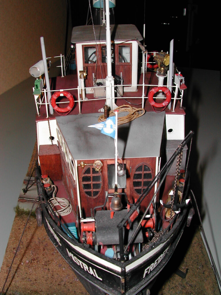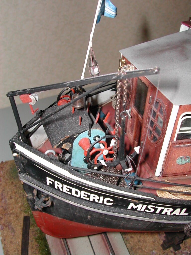 Ein interessantes Problem beim Nachbau waren die Veränderungen, die Franz Scheriau in den zwei Jahren auf der großen FrEDERIC MISTRAL vornahm. Bei jedem Fotobesuch schaute das Schiff anders aus. Franz bot mir sogar scherzhaft an, ich sollte den achteren Aufbau im Modell gestalten, er würde ihn dann im Original nachbauen. Ich entschied mich aber, den achteren Decksaufbau im Modell weg zu lassen. Nicht dass mir die Kreation von Franz missfällt, aber da der achtere Mast in den Aufbau integriert ist, wäre das Deck nur mit sehr viel Aufwand abzunehmen gewesen.