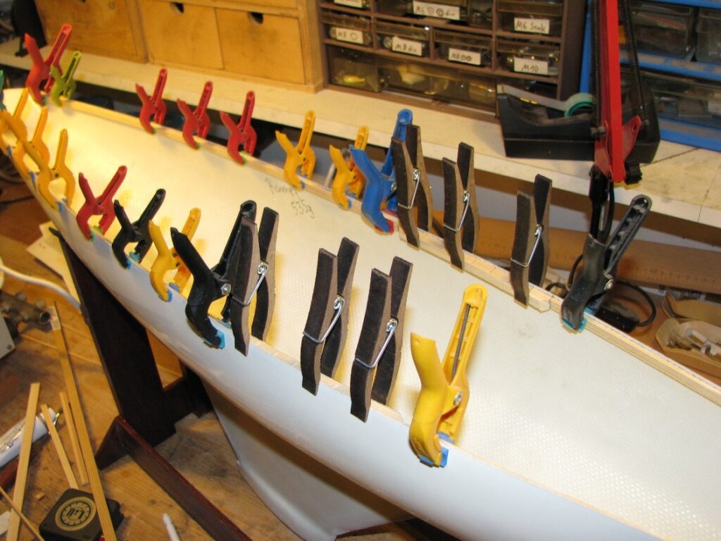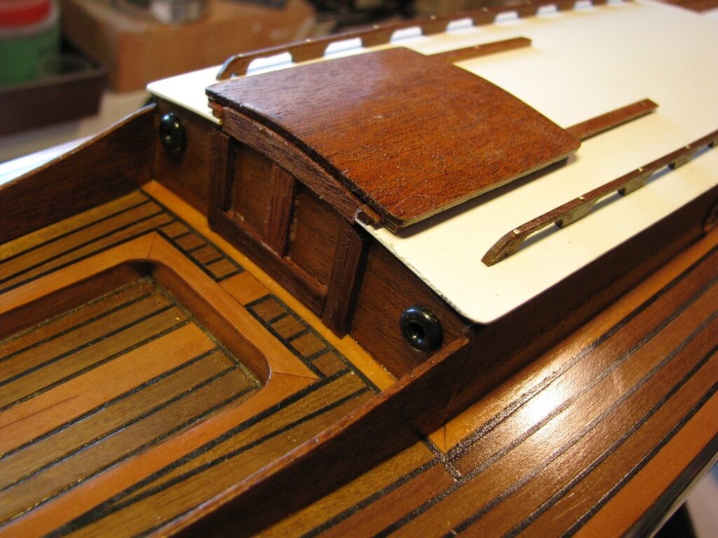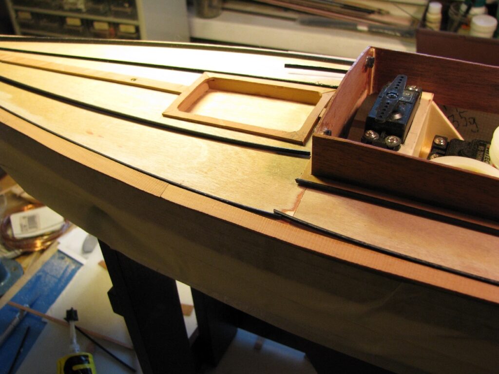 Danach folgen die Beplankung mit Holzleisten und schwarzen Plastikstreifen sowie der weitere Decksausbau mit der Fertigstellung der Kajüte und der Plicht.