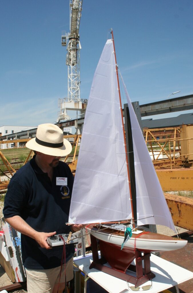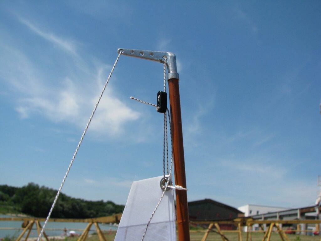 Dann beginnt das Auftakeln. Der Mast und der Großbaum werden aus CFK-Rohren vom Drachenbau mit den Beschlägen aus Weißmetall komplettiert.