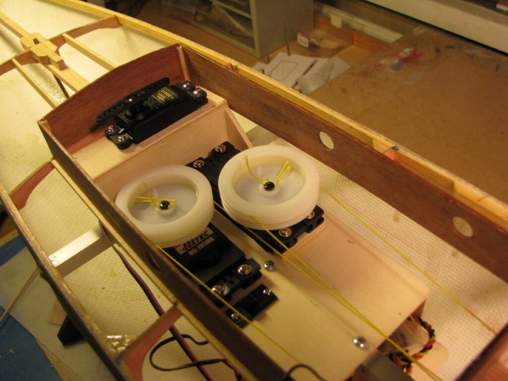 Nach dem Einbau der weiteren Decksverstärkungen wird das Technikgerüst mit den beiden Hitec-Segelwinden für Großsegel und Genua sowie mit dem Ruderservo eingesetzt.
